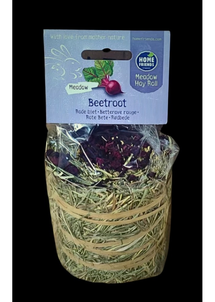 Homefriends ливадно сено ролка с червено цвекло е 100 % натурална допълваща храна за гризачи и зайци, богата на сурови фибри с вкусен топинг. Тя съдържа висококачествено ливадно сено, обогатено с вкусно червено цвекло. Сеното е богато на фибри и помага на храносмилателната система на вашия домашен любимец да работи добре. Тази вкусна смес подобрява чревната флора и дава на зайци и гризачи допълнителна енергия и жизненост.