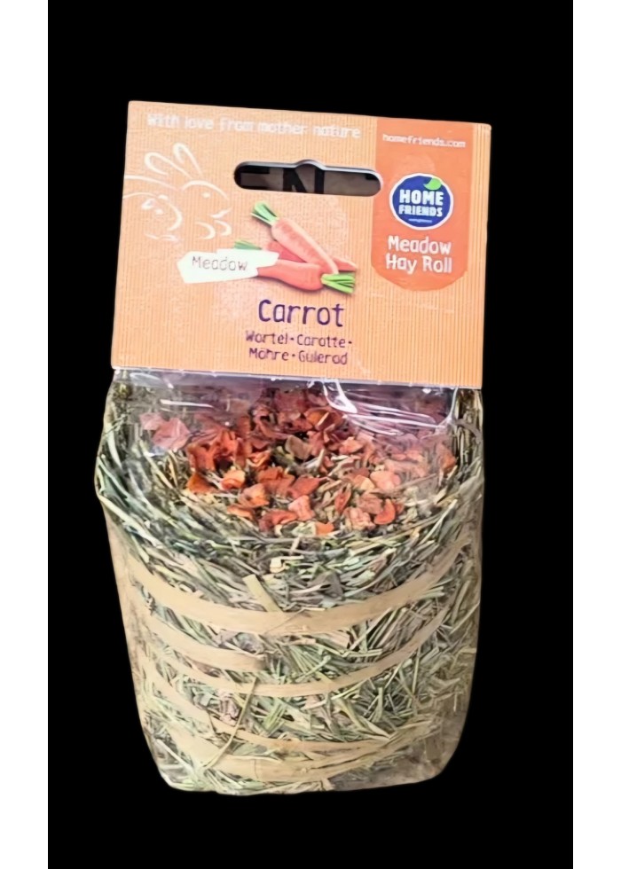 Homefriends ливадно сено ролка с морков е 100 % натурална допълваща храна за гризачи и зайци, богата на сурови фибри с вкусен топинг. Тя съдържа висококачествено ливадно сено, обогатено с вкусен морков. Сеното е богато на фибри и помага на храносмилателната система на вашия домашен любимец да работи добре. Тази вкусна смес подобрява чревната флора и дава на зайци и гризачи допълнителна енергия и жизненост.